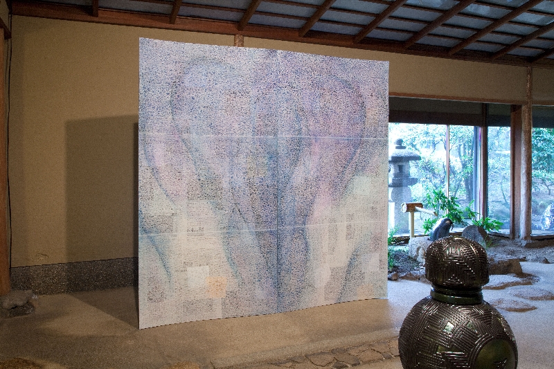 Life/懐胎では文字通り全てを包み込むイメージ、Life/誕生は開放のイメージをもって表現しています。プロダクト(支持体)と絵画の融合をラウンド状の形体に託し、日本の広義でのライフ(生活)空間である茶室空間に展示しました。尚、石畳の配置を考慮の上、それらに沿うように設置しています。